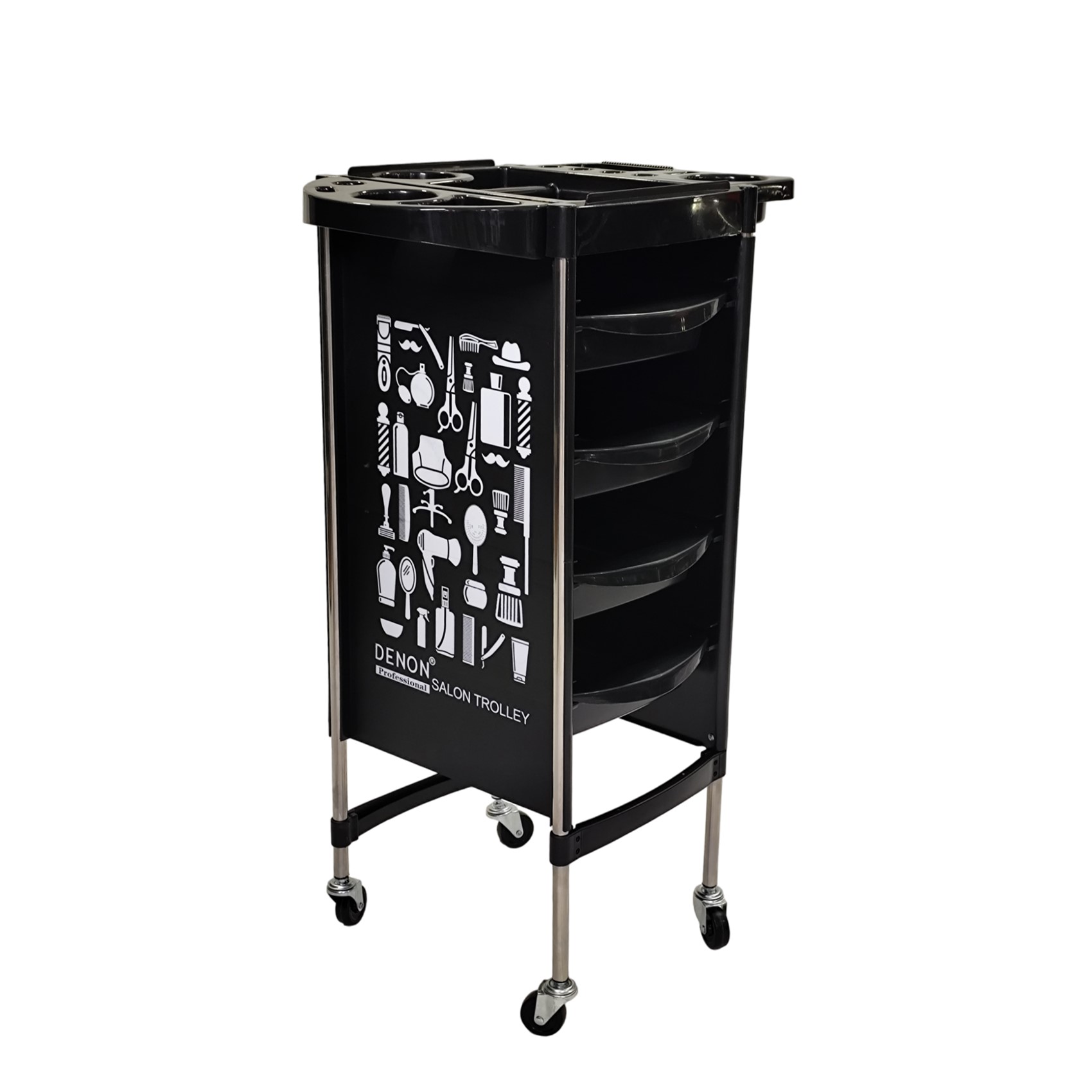 Este estante de barbería, es una herramienta esencial para mantener organizados todos los instrumentos y productos de cuidado capilar. Con un diseño elegante en color negro, este carrito cuenta con múltiples compartimentos y estantes para una organización eficiente. La superficie superior está equipada con espacios específicos para tijeras, peines y otros utensilios, asegurando que siempre estén al alcance de la mano. Posee compartimentos moldeados en la parte superior para sostener varias herramientas.